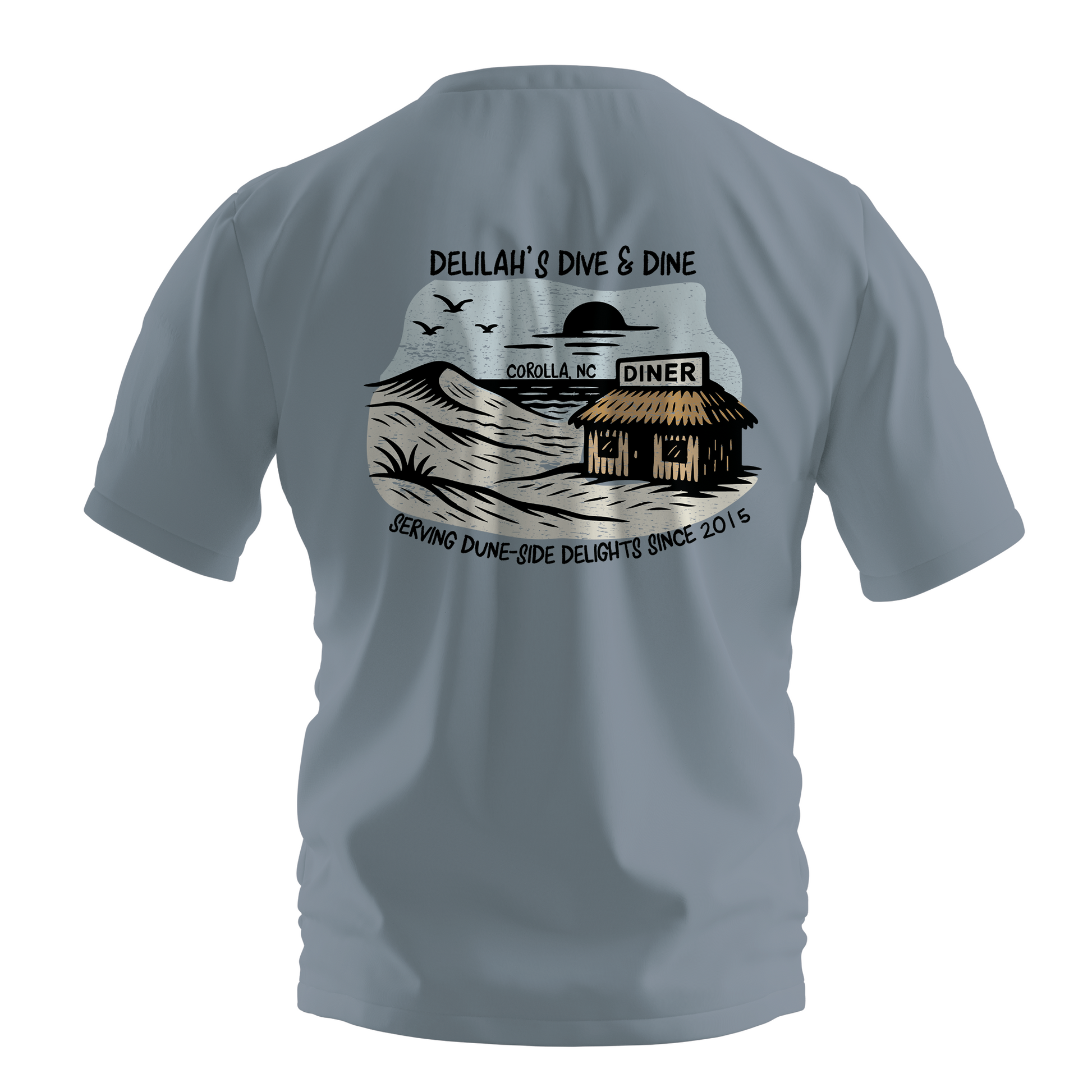 Bring a slice of the Outer Banks to your everyday style with the Delilah’s Dive & Dine Tee. Inspired by classic coastal diners and sunny Corolla mornings, this retro-themed design features a dune-side shack under a rising sun — a tribute to comfort food, ocean breezes, and small-town charm.