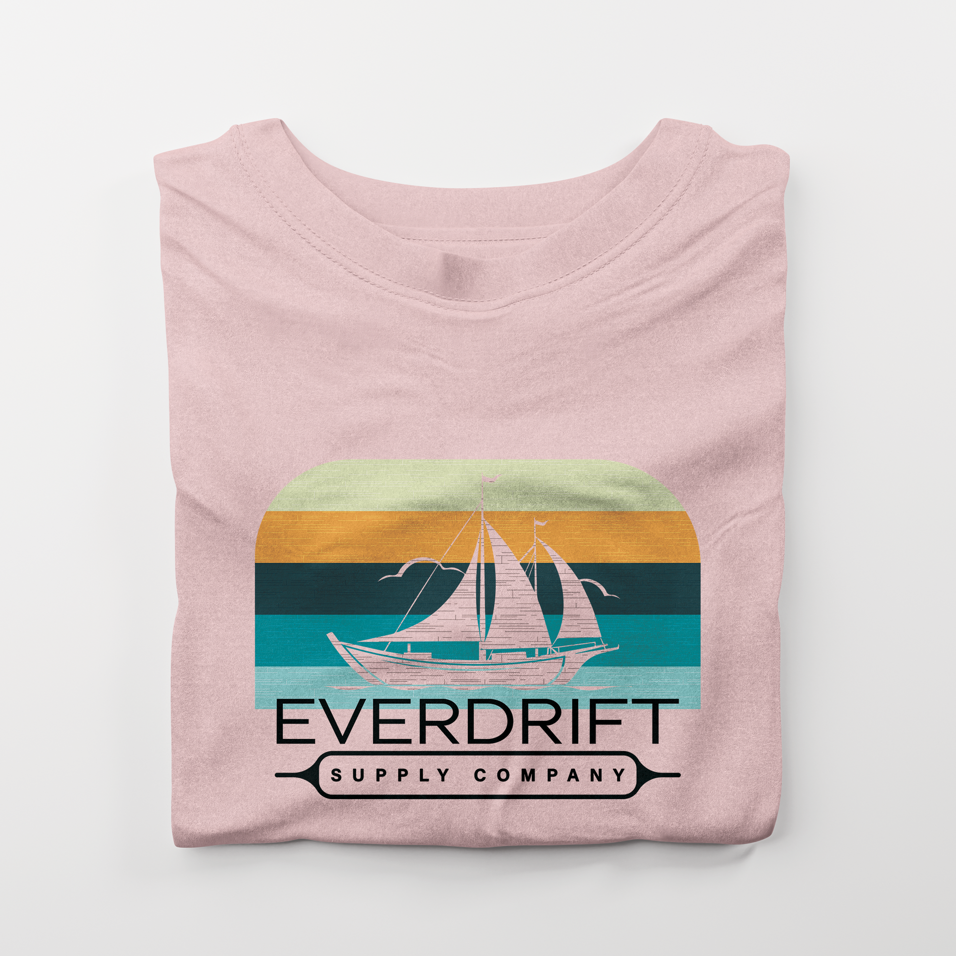 Set sail in style with the Everdrift Choppy Waters Tee. Featuring a clean white sailboat silhouette against a retro-inspired horizon of seafoam, teal, and sunset tones, this design captures the spirit of exploration and the calm confidence of life on the water.
